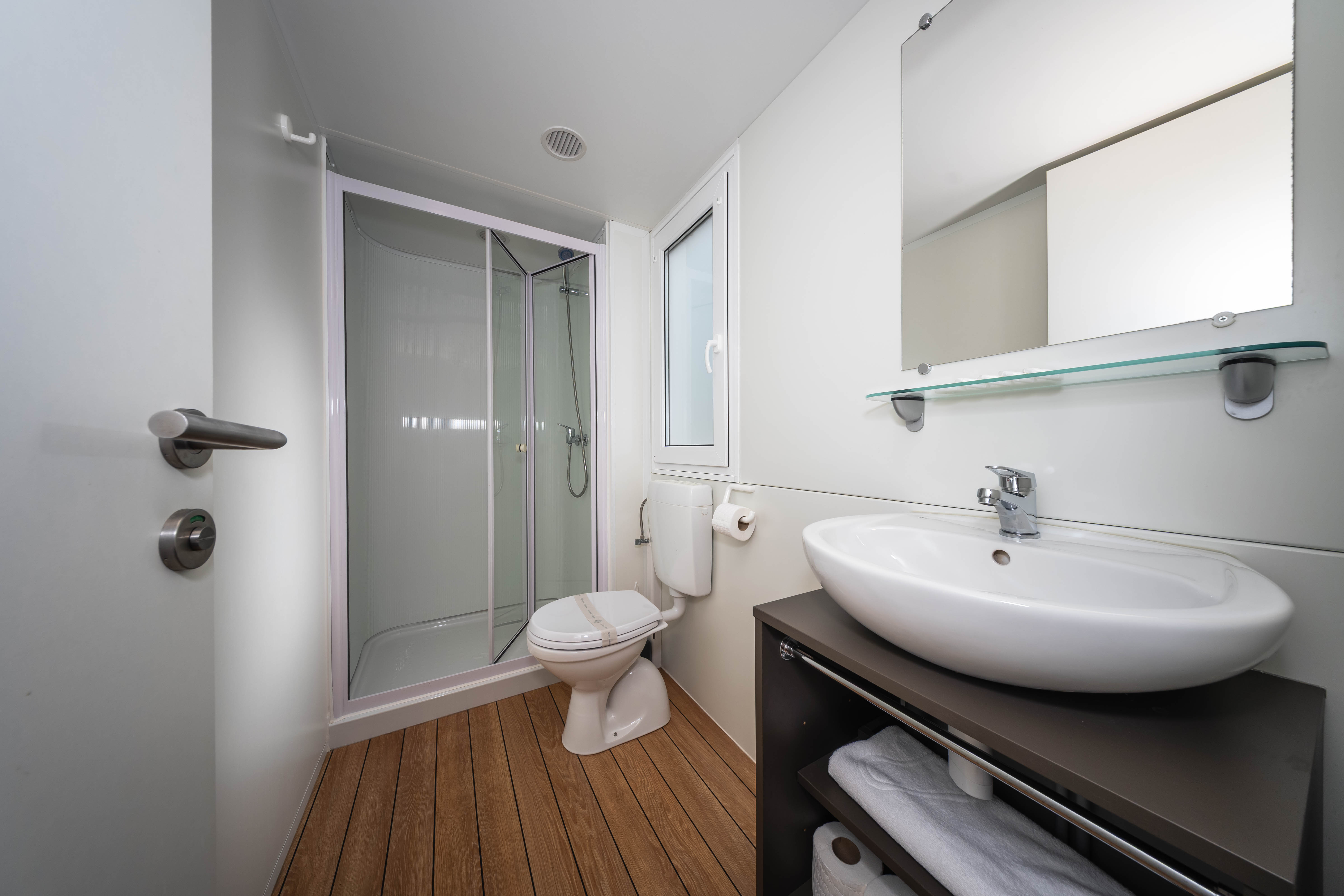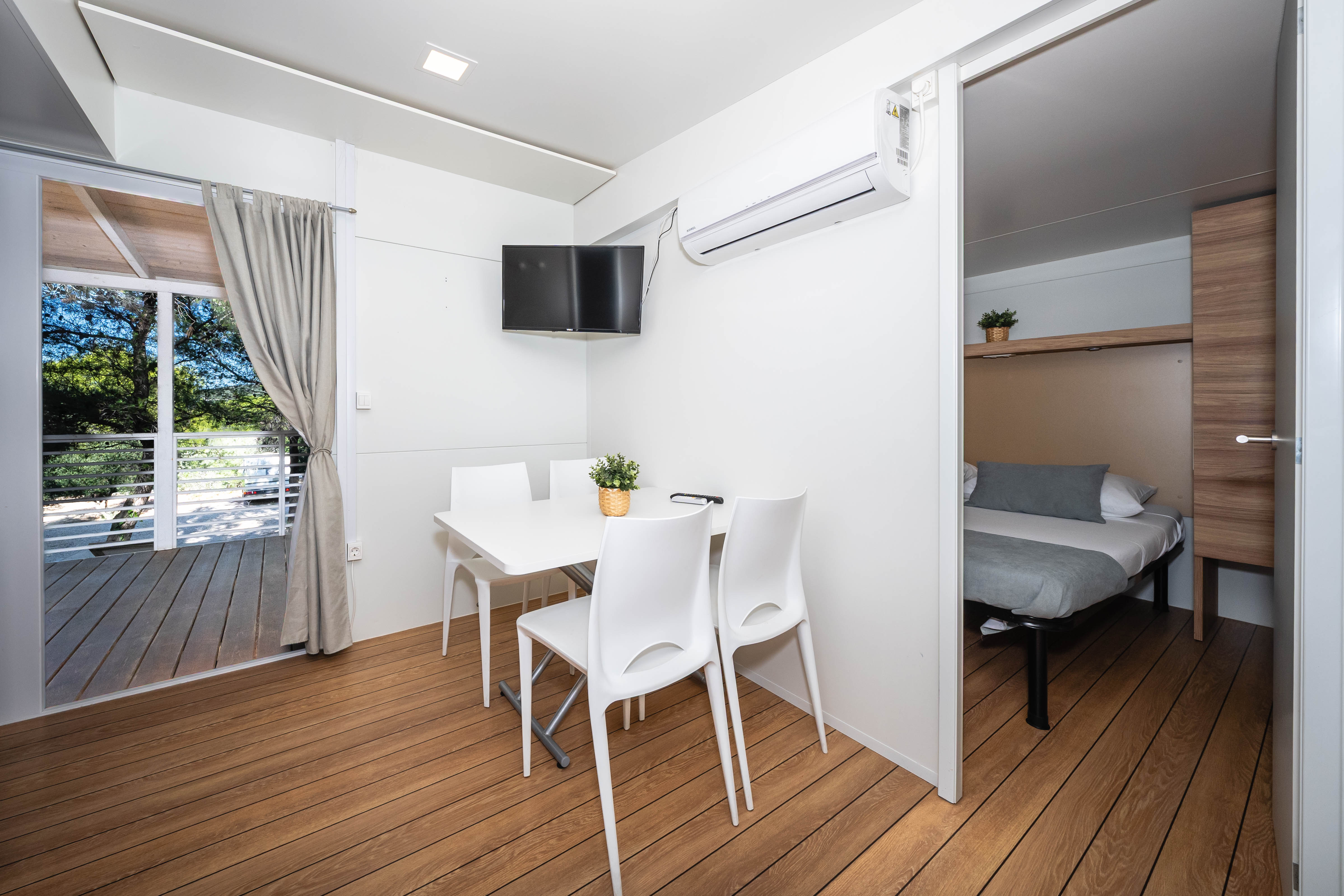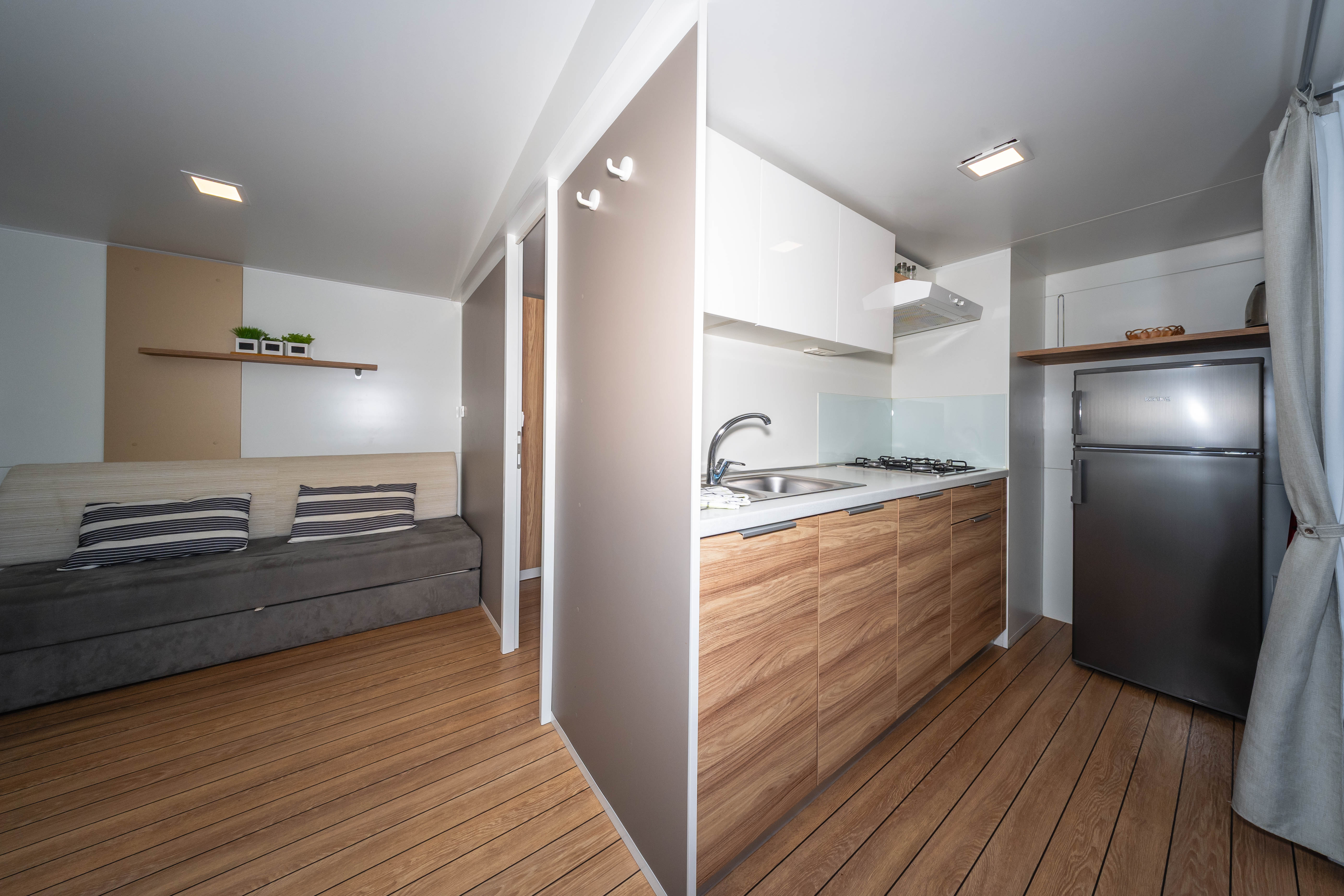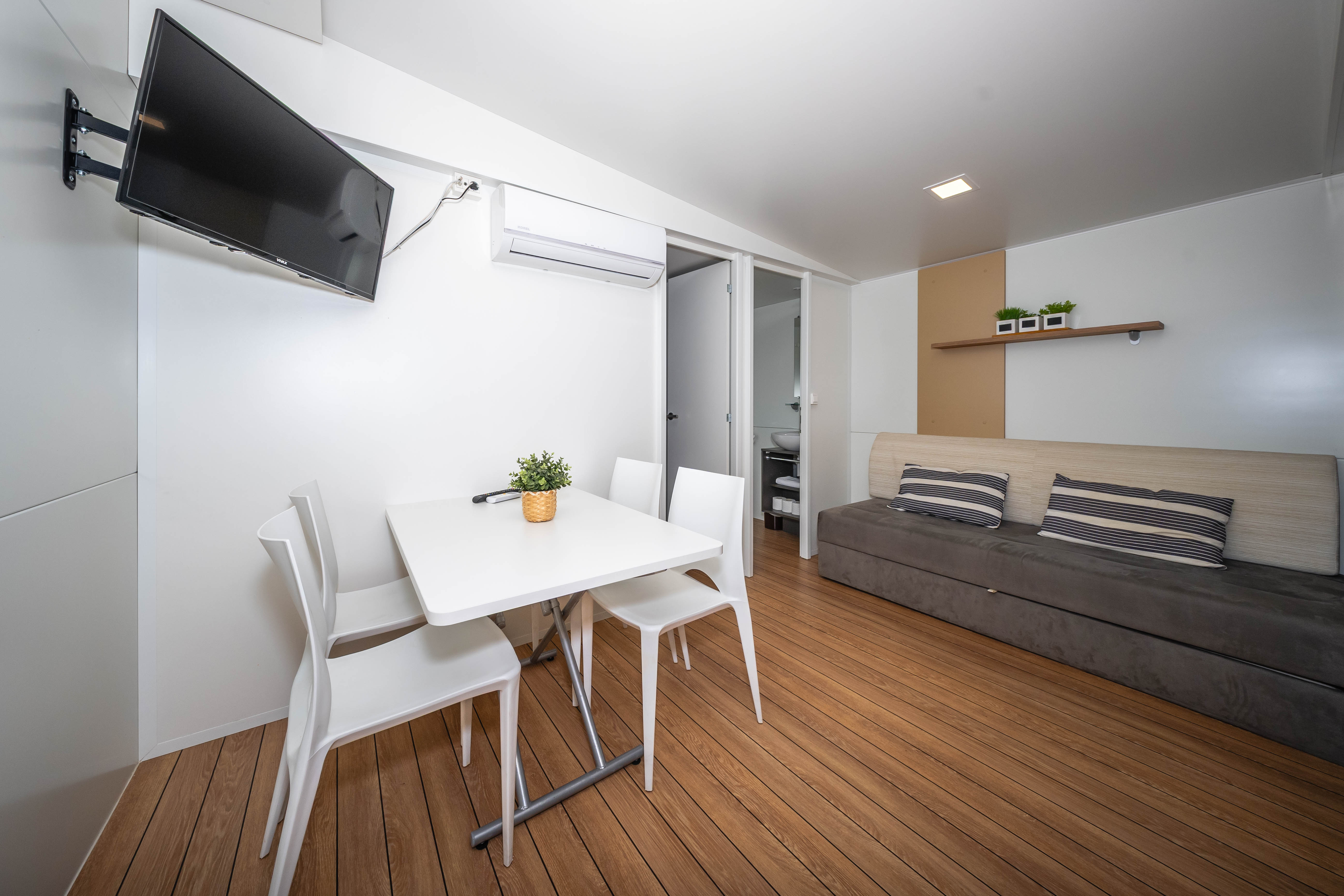 La superficie della casa mobile Comfort è di 30 m2. Tutte le case sono completamente arredate con un ampio terrazzo coperto. Il posto macchina si trova proprio accanto alla casa. *Questa casa mobile e' disponibile in piu' variazioni.